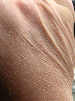Typically, flaky skin is the first sign of dryness. This is caused by the rapid swelling and shrinking that was discussed in the Short-Term Effects article. This constant cycle of gross bloating followed by swift desiccation increases the amount of individual corneocytes that have broken away from the lipid matrix, which of course can be compromised by surfactants. This loss in cohesiveness leads to flaky skin. If the condition worsen, the flaking will become more evident and lead to scaling, where cracks in the skin will appear. This is when the more tactile and sensory characteristics of dry skin become evident.